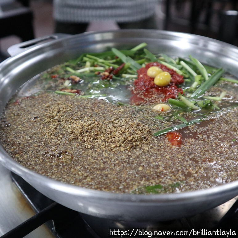 밥을 주문하면 국물이 자작해진 전골에 쑥가루를 넣어주시는데 이게 정말 향긋하고 환상-