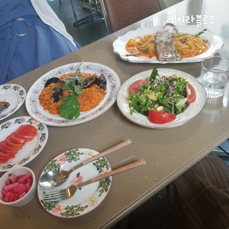 우리는 미식회관 맘대로 샐러드와 해산물 토마토리조또, 매콤크림 삼겹살 파스타를 먹었는데, 모두 맛있었다!